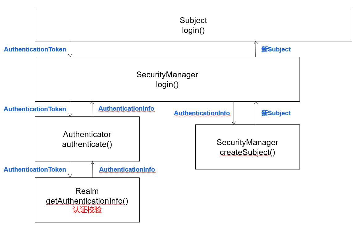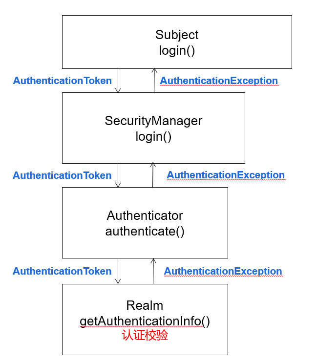 AuthenticationException及其子类的异常,包括:DisabledAccountException(禁用的帐号)、UnknownAccountException(错误的帐号)、IncorrectCredentialsException (错误的凭证)等。这些异常可在调用subject.login(token)的地方捕获并处理 - 认证成功后,Realm 接口的 getAuthenticationInfo 方法返回的 AuthenticationInfo 对象一直向上传递到 SecurityManager.login() 方法