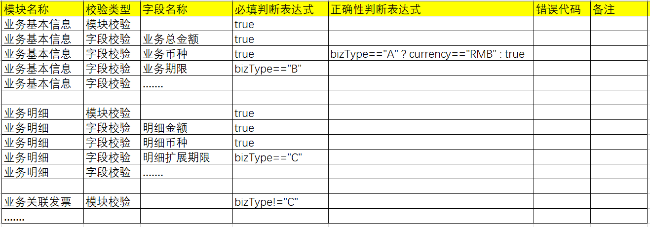 因为业务方案的字段和规则很容易变更,所以应该用配置表,灵活配置每个模块下需要校验的字段,以及它们必填的条件,还能配置这些字段内容的正确性校验规则,如“业务币种”字段有个正确性规则:业务类型=A时,业务币种必须为人民币。